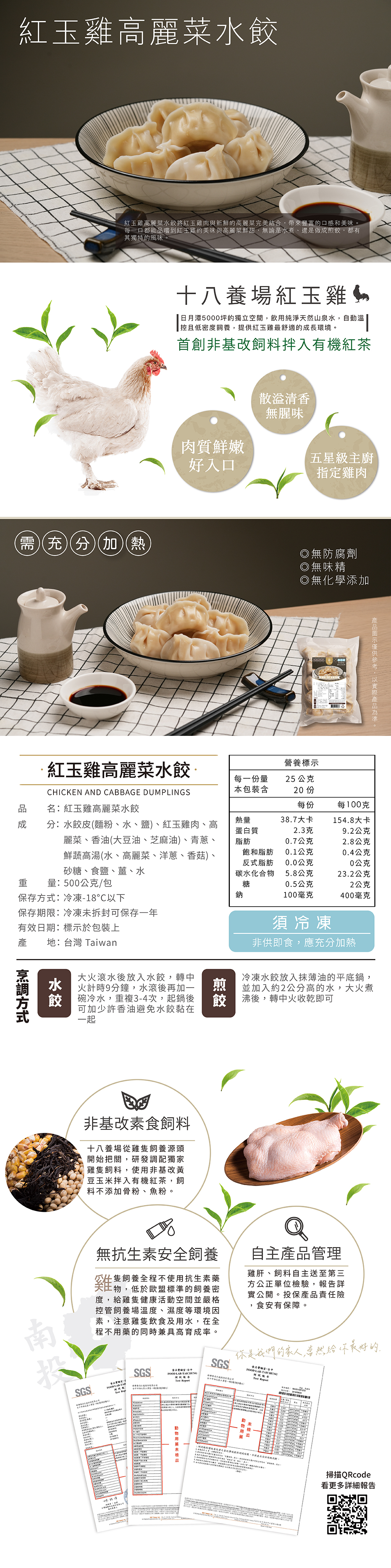 紅玉雞高麗菜水餃將紅玉雞肉與新鮮的高麗菜完美結合,帶來豐富的口感和美味。每一口都能品嚐到紅玉雞的美味與高麗菜鮮甜,無論是水煮、還是做成煎餃,都有其獨特的風味。